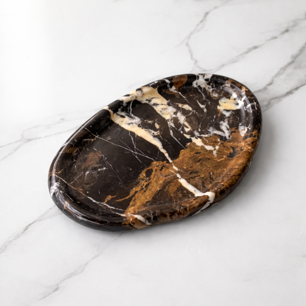Balou ist mehr als nur ein Dekotablett. Gefertigt aus schwarzem Naturmarmor mit goldenen Maserungen wirkt dieses Objekt zugleich luxuriös, kraftvoll und raffiniert. Die organische Form und das ausdrucksstarke Marmormuster machen Balou zu einem stilvollen Blickfang, der Ruhe und Charakter in jedes Interieur bringt.