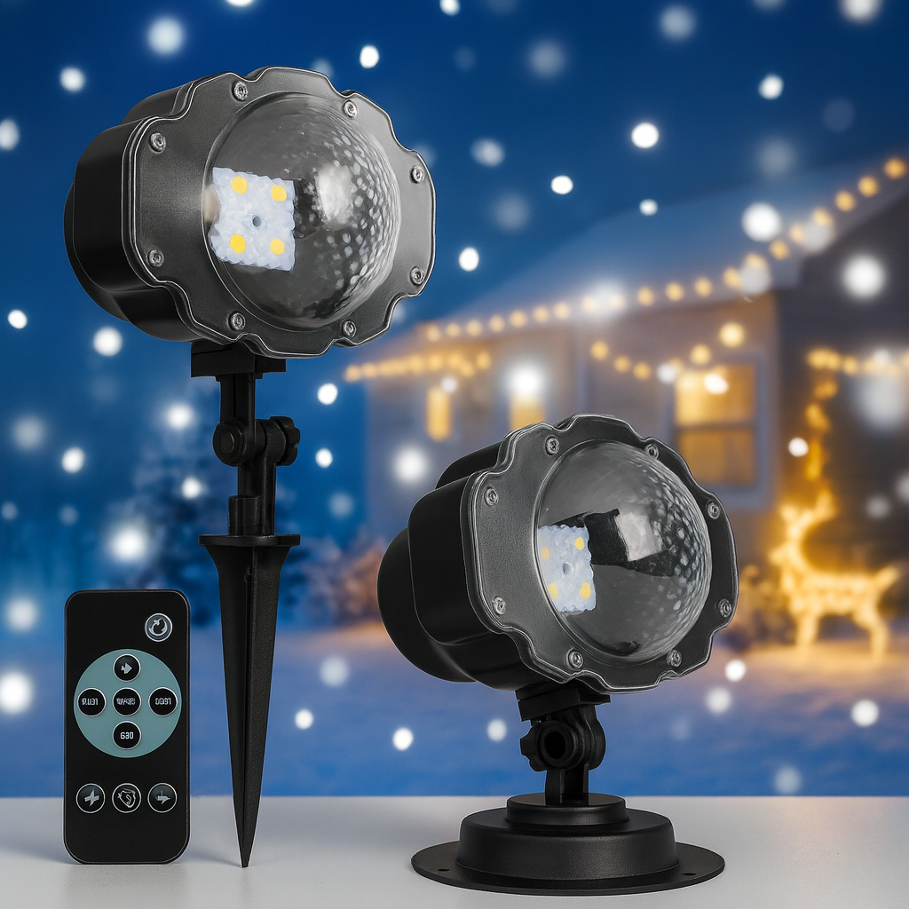 Er projiziert sanft fallenden Schnee und festliche Lichteffekte – ideal, um Wände, Fassaden oder Innenräume in eine traumhafte Winterlandschaft zu verwandeln.